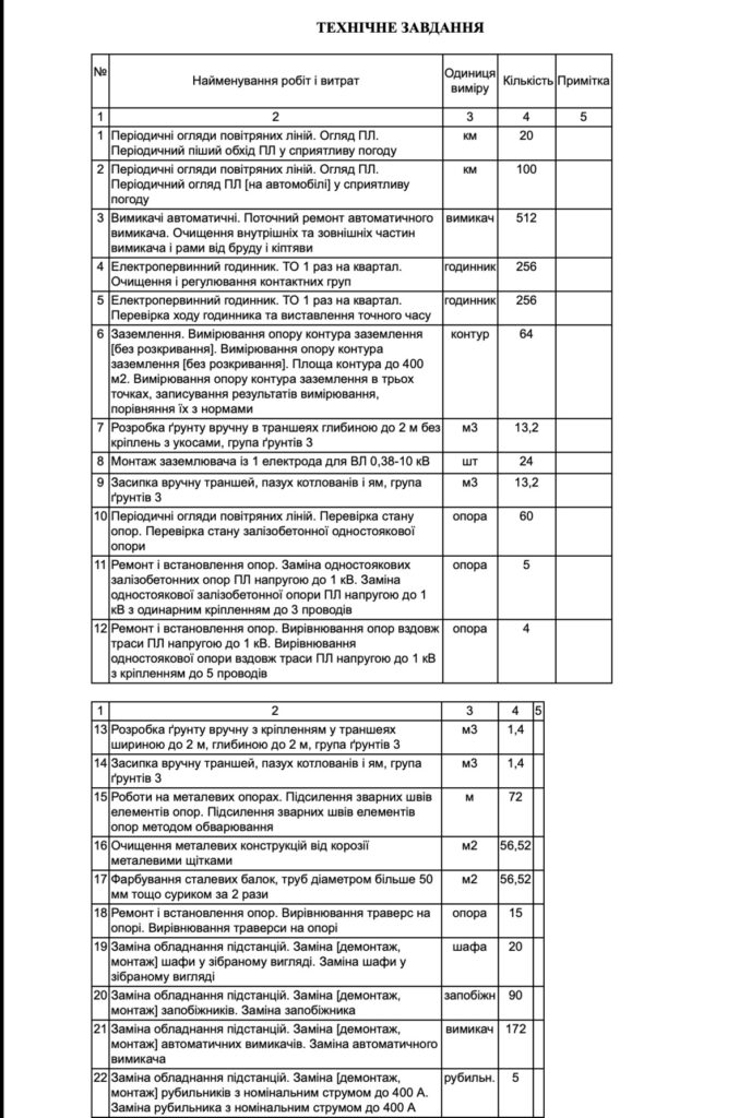 Згідно з тендерною документацією, постачальник має надавати послуги протягом року – до 31 грудня 2026 року. У технічному завданні зазначені 44 роботи. Серед них: