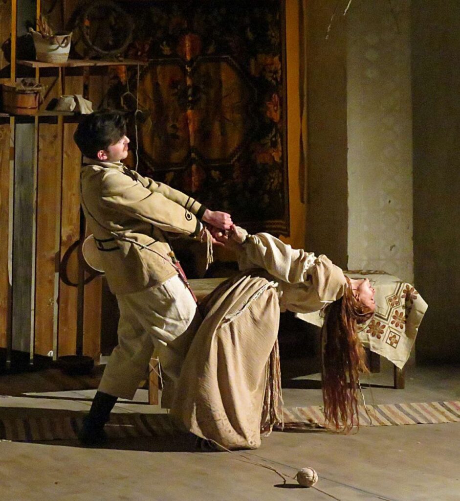«Вовчиха» — камерна вистава в жанрі етноекспресії, що через пластику, ритм, тишу та живий звук досліджує родову пам’ять і складні стосунки між матір’ю та донькою. Музика народжується безпосередньо на сцені — з використанням дримби та сопілки.
