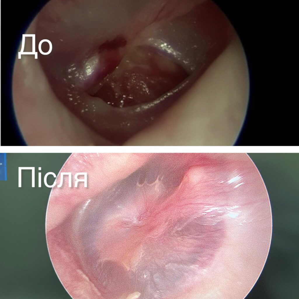 Після обстеження лікарі ухвалили рішення про оперативне втручання. Для відновлення барабанної перетинки провели мірингопластику за методикою Underlay із використанням фасції скроневого м’яза — одного з найефективніших методів у сучасній отоларингології.