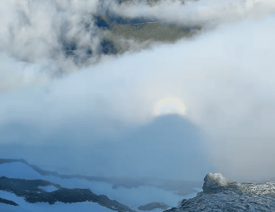 «Брокенський привид» — це рідкісне явище, коли спостерігач бачить у хмарах свою тінь від сонця. Примітно, що тінь може бути дуже великою і навіть оточеною кількома кольоровими кільцями.
