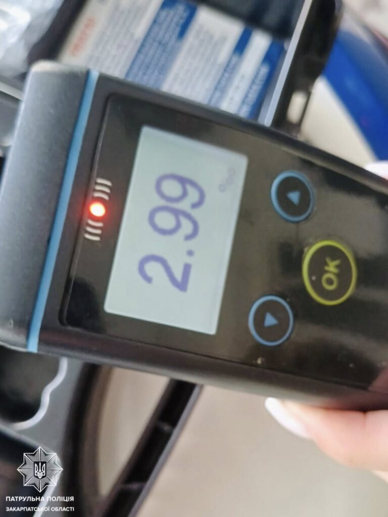 Під час спілкування з кермувальником інспектори виявили ознаки алкогольного сп’яніння. Перевірка за допомогою алкотестера підтвердила це — прилад показав 2,99 проміле.