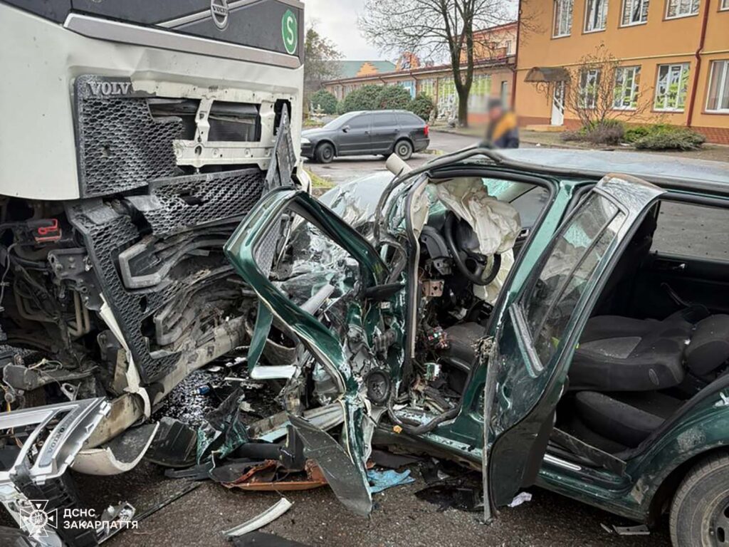 У Мукачеві рятувальники визволили чоловіка з автомобіля, пошкодженого внаслідок дорожньо-транспортної пригоди. Аварія сталася вдень 7 лютого на вулиці Пряшівській, де зіткнулися легковик Volkswagen Golf і вантажівка Volvo.