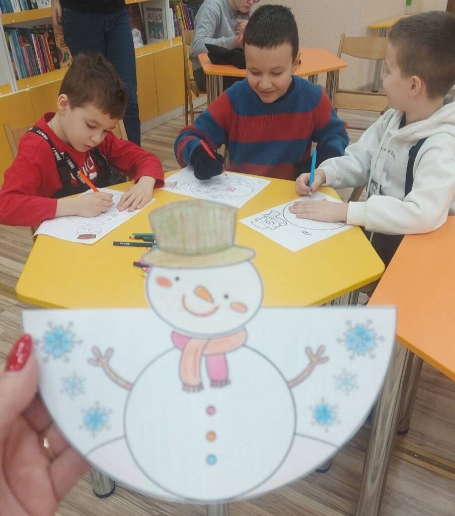 Після пізнавальної частини на дітей чекала творча програма: учасники виготовляли паперову іграшку «Веселий сніговик», відгадували загадки, розшифровували анаграми та передавали емоції своїх сніговичків.