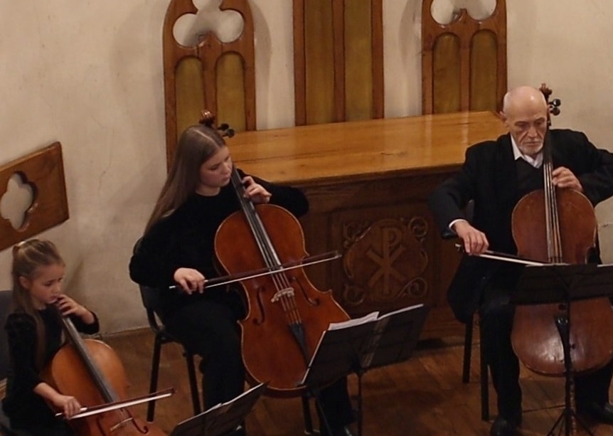 На сцені — тріо віолончелістів: відомий музикант Леонід Борисович Никитюк та його талановиті учениці Марта і Поліна Тулюк. Їм акомпанували концертмейстер Наталія Іванівна Удут і юна піаністка Іванна Тулюк, учениця Тетяни Іванівни Райко. Усі сестри Тулюк навчаються в Мукачівській школі мистецтв імені С. Мартона.