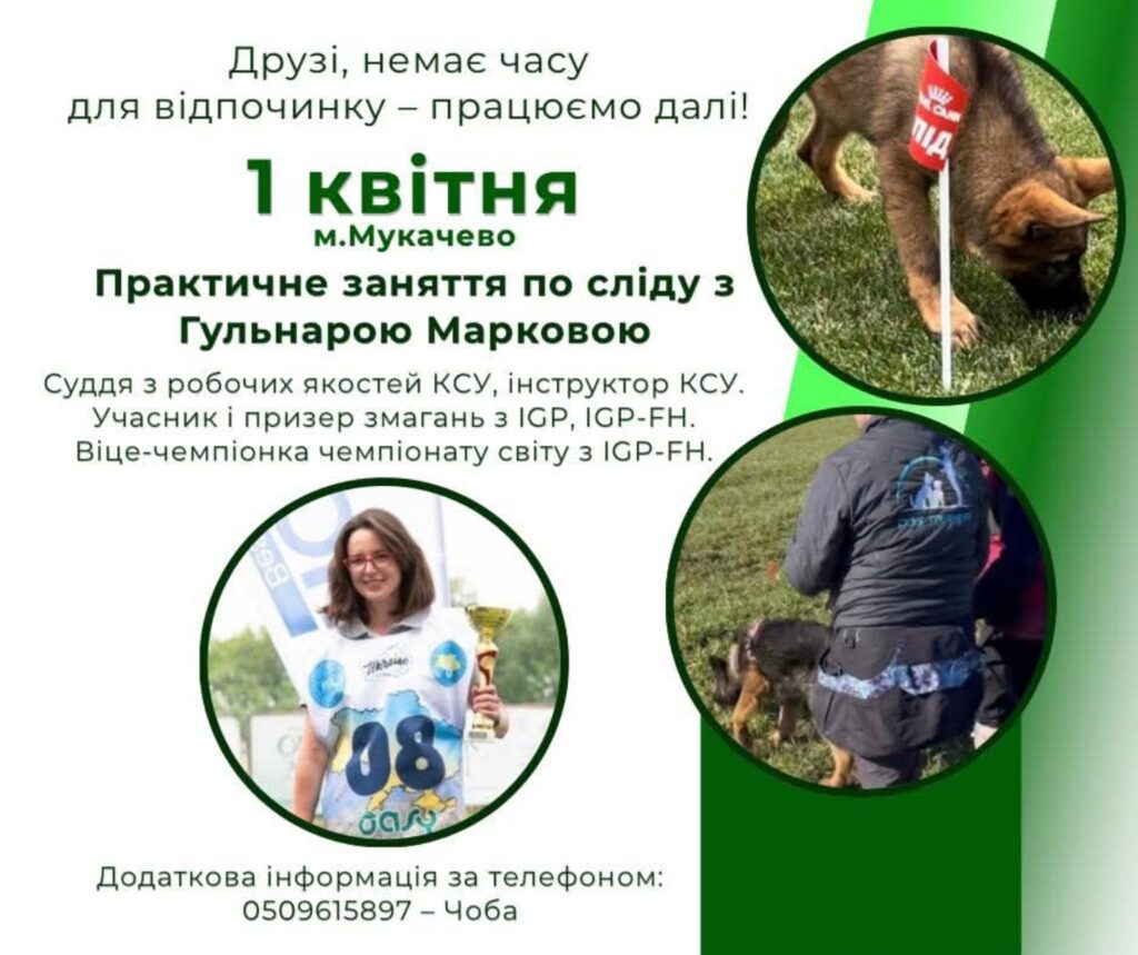 1 квітня у Мукачеві відбудеться практичне заняття з пошуку сліду за участю інструкторки та судді з робочих якостей собак Гульнари Маркової.
