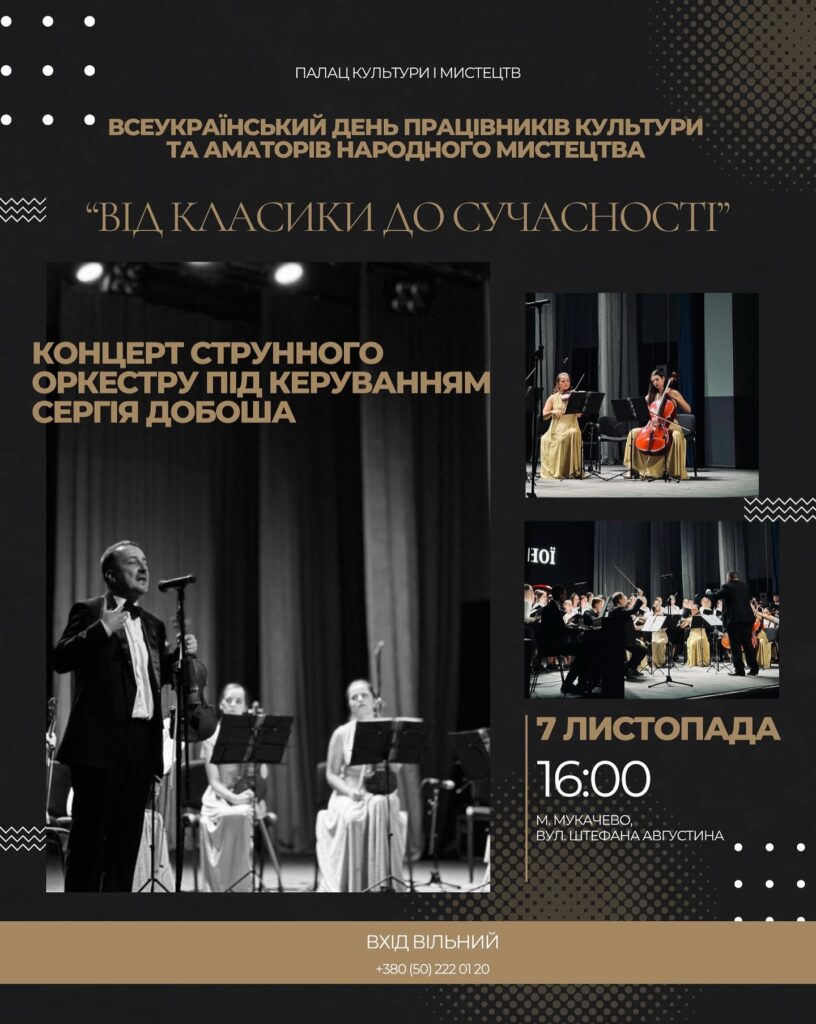 У Мукачеві в Палаці культури і мистецтв Мукачева 7 листопада о 16:00 відбудеться музичний квартирник «Від класики до сучасності» — камерний вечір, де артист і глядач опиняються на одній сцені. Вхід вільний.