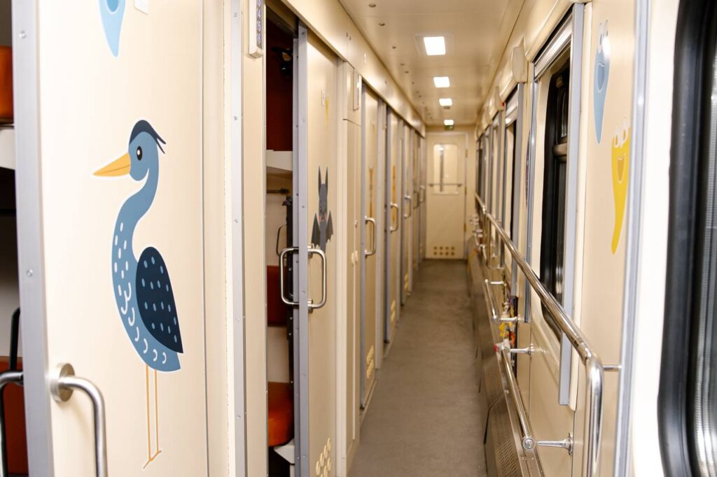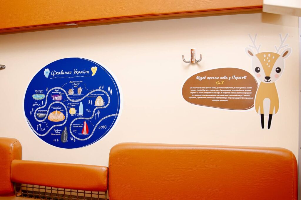 Нові вагони вирізняються унікальним дизайном купе: кожне з них присвячене окремому місцю в Україні. Яскраві ілюстрації знайомлять дітей з історією регіонів, тваринами та рослинами. Зокрема, у вагонах можна побачити зображення крабів, які мешкають поблизу Аджигольського маяка на Херсонщині.