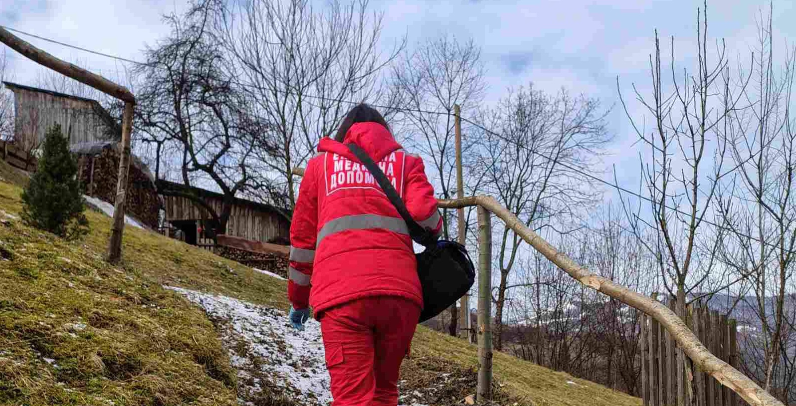 Через складні гірські умови автомобіль швидкої допомоги не зміг піднятися крутим підйомом до будинку пацієнтки. Медики взяли необхідне обладнання та пішки дісталися до оселі.