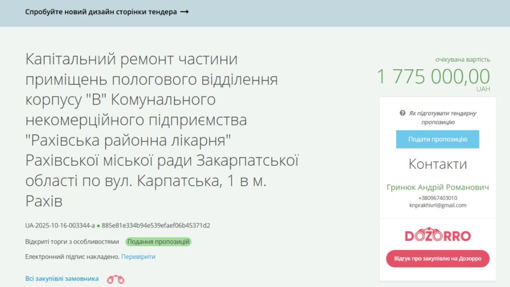 У Рахові під кінець року вдруге оприлюднили тендер на ремонт частини пологового відділення корпусу “В” Рахівської районної лікарні. Оголошена вартість — 1 мільйон 775 тисяч гривень. Виконати роботи мають до 31 грудня 2025 року.