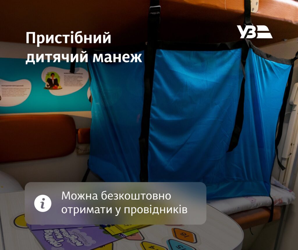 Крім того, Укрзалізниця облаштує кожен вагон пристібним дитячим манежем (його можна безкоштовно отримати у провідника). У кожному потязі в наявності буде підігрівач для дитячого харчування, розмальовки й олівці, книги шрифтом Брайля.