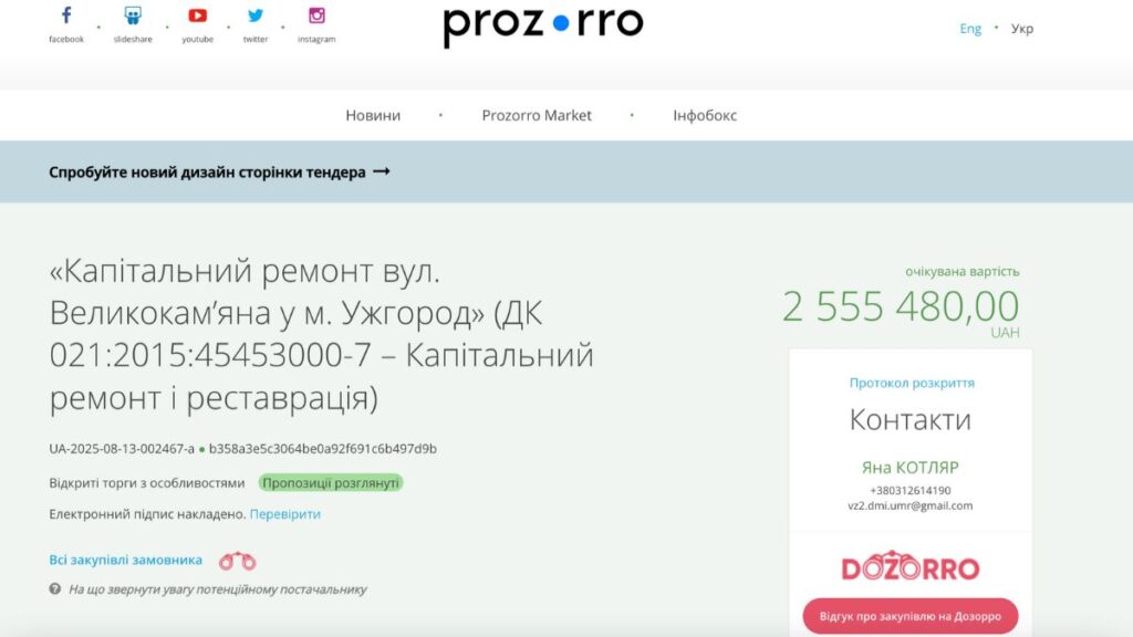 В Ужгороді за 2 мільйони 555 тисяч 480 гривень хочуть капітально відремонтувати вулицю Великокам’яну. Замовник – департамент міської інфраструктури Ужгородської міської ради. Виконати роботи підрядник має до 31 грудня 2025 року.