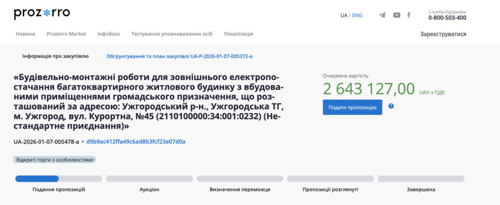 ТОВ “Закарпаттяобленерго” оголосило тендер на проведення будівельно-монтажних робіт для зовнішнього електропостачання багатоквартирного будинку по вулиці Курортній, 45. На це готові виділити 2 мільйони 643 тисячі 127 гривень. Дата поставки до 3 червня 2027 року.
