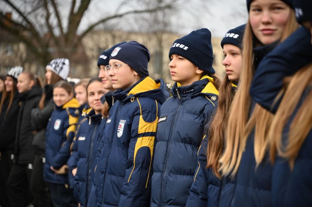 Разом із керівництвом області та міста прапор на площі Народній перед будівлею ОВА підняли юні зірки спорту – Анна Баланда, Вікторія Потрогрош та Анастасія Форкавец.