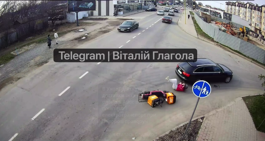 У Ужгород сталася дорожньо-транспортна пригода за участі електроскутера служби доставки мережі супермаркетів Сільпо та легковика Audi.