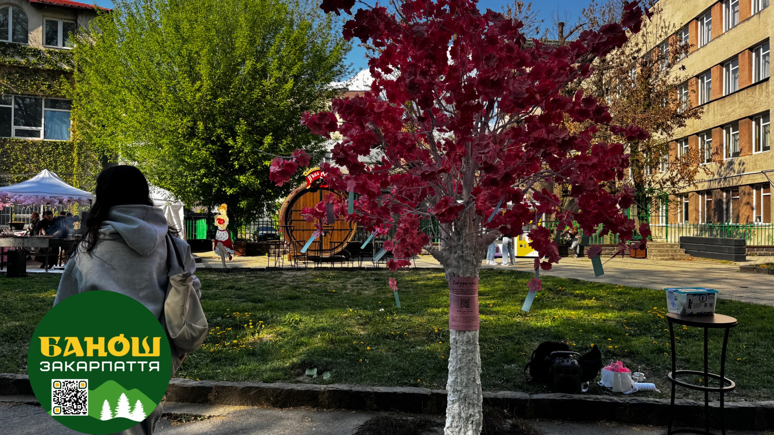 Поруч працює інсталяція «Дерево бажань». Відвідувачі можуть долучитися до ініціативи – зробити донат, написати своє бажання та залишити його на гілках штучної сакури.
