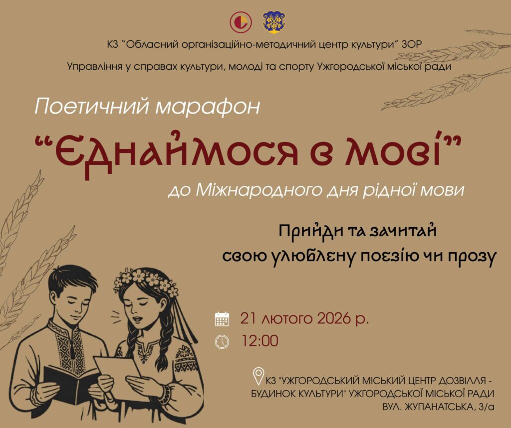 21 лютого 2026 року з нагоди Міжнародного дня рідної мови в Ужгороді пройде культурно-мистецька акція — поетичний марафон «Єднаймося в мові».