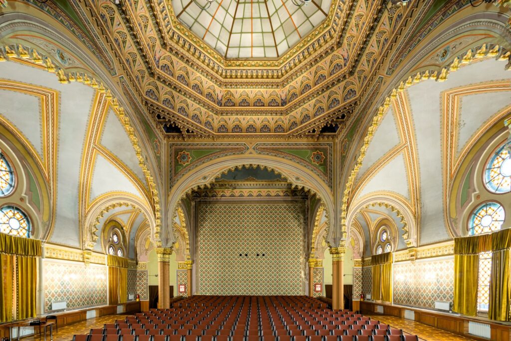 Будівля філармонії розташована в колишній синагозі, зведеній у 1904 році за проєктом архітекторів Дюли Паппа та Ференца Саболча. Споруда поєднує елементи романтичного, візантійського та мавританського стилів.