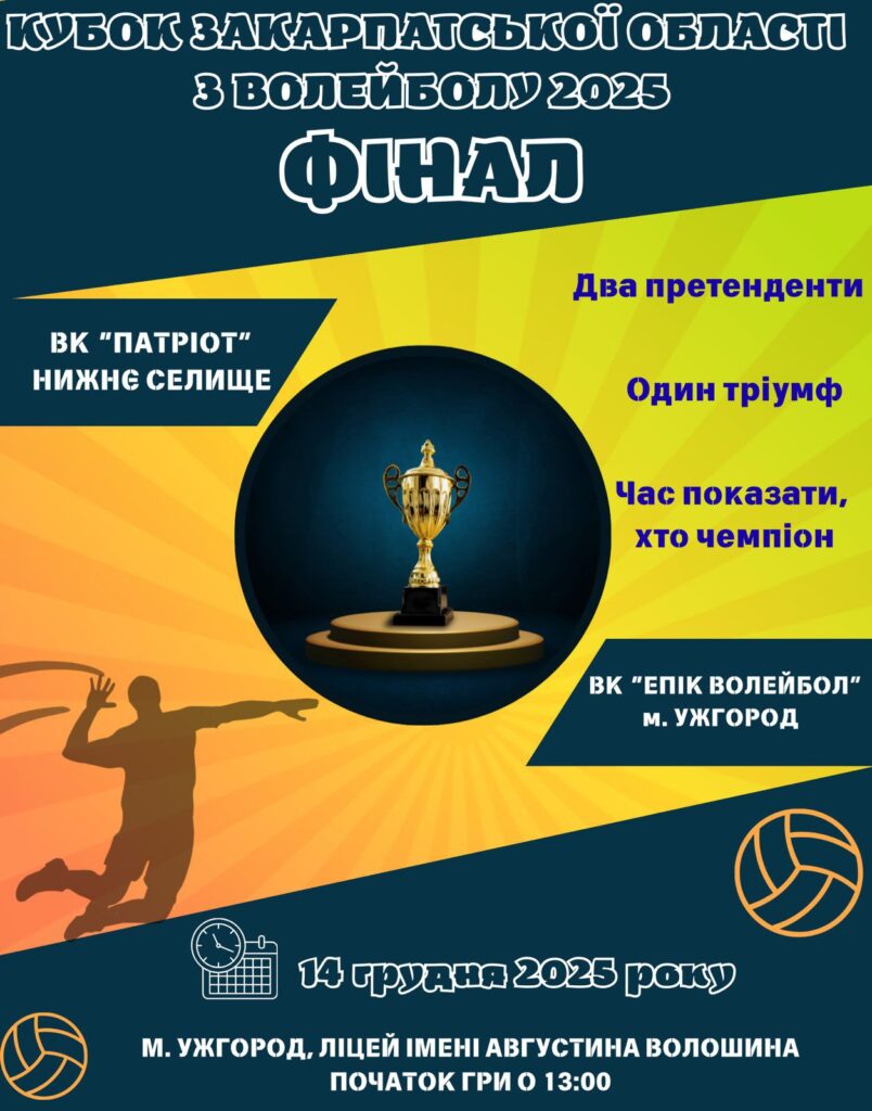 Уже завтра, 14 грудня, в Ужгороді відбудеться фінальний матч Кубка Закарпатської області з волейболу 2025 року, який визначить чемпіона регіону.