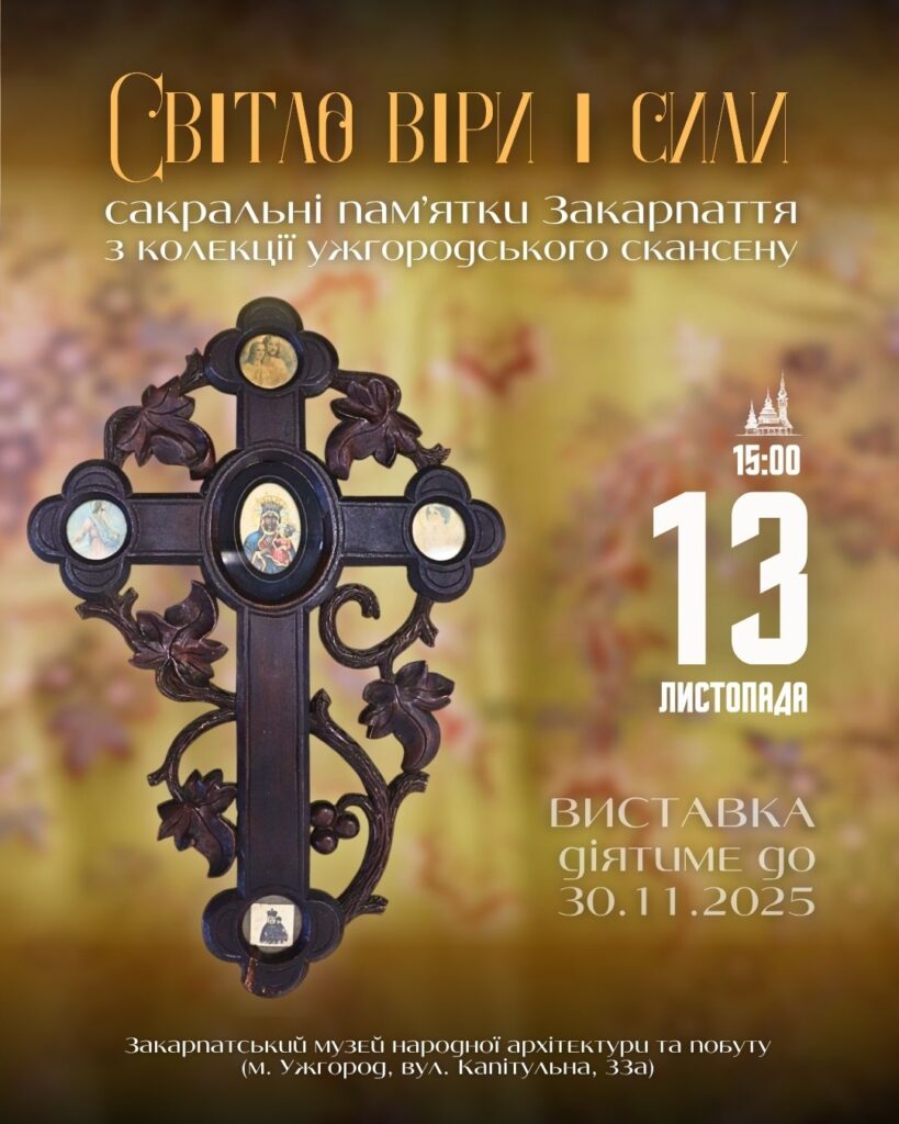 13 листопада о 15:00, у великій виставковій залі Закарпатського музею народної архітектури та побуту (м. Ужгород, вул. Капітульна, 33а) відкриють виставку «Світло віри і сили: сакральні пам’ятки Закарпаття з колекції ужгородського скансену».