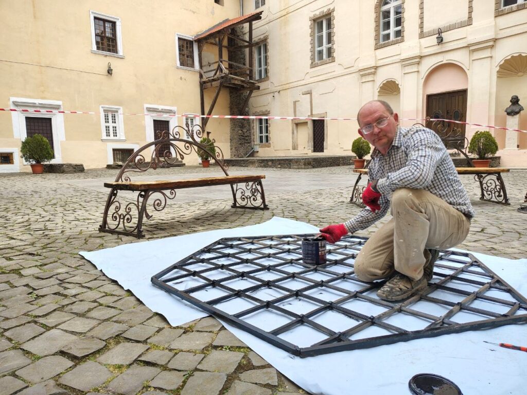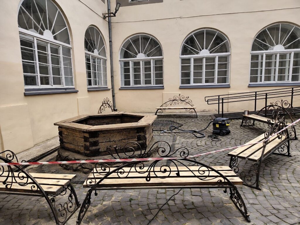 Також у дворику оновили лавки — вони стали зручнішими та гармонійно вписуються в історичну атмосферу. Відвідувачі можуть відпочити, насолоджуючись краєвидом палацу.