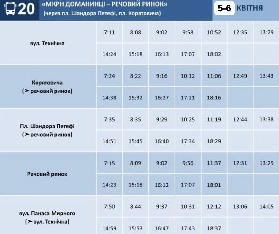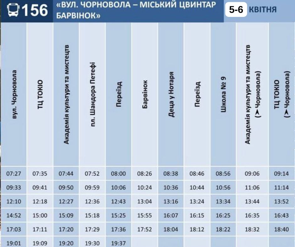 Зокрема, зміни стосуються автобусних маршрутів №18, 20, 24, 38 та 156. У ці дні транспорт курсуватиме за спеціальним святковим графіком, адаптованим до пасажиропотоку та традиційних великодніх заходів.