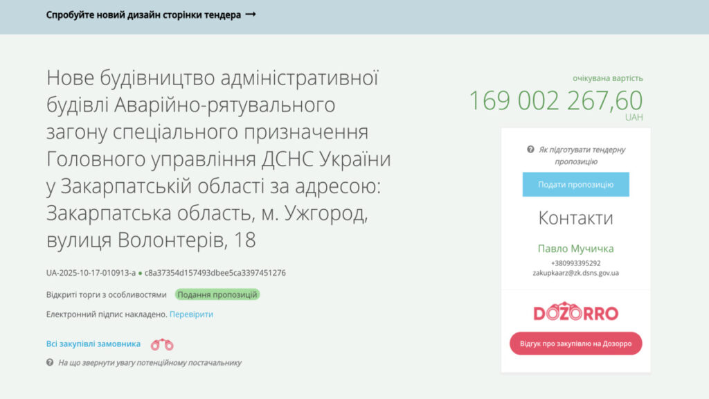 Замовник – Аварійно-рятувальний загін спеціального призначення ГУ ДСНС у Закарпатській області. Про це йдеться на сайті Prozorro.