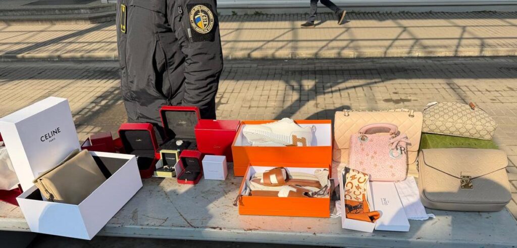 Серед виявленого товару були п’ять дамських сумочок марок Gucci, Chanel, Dior, Celine та Louis Vuitton, шовкова хустка від Celine, жіноче взуття від Hermes, а також ювелірні вироби: дві каблучки, браслет та годинник від Van Cleef & Arpels та Cartier.