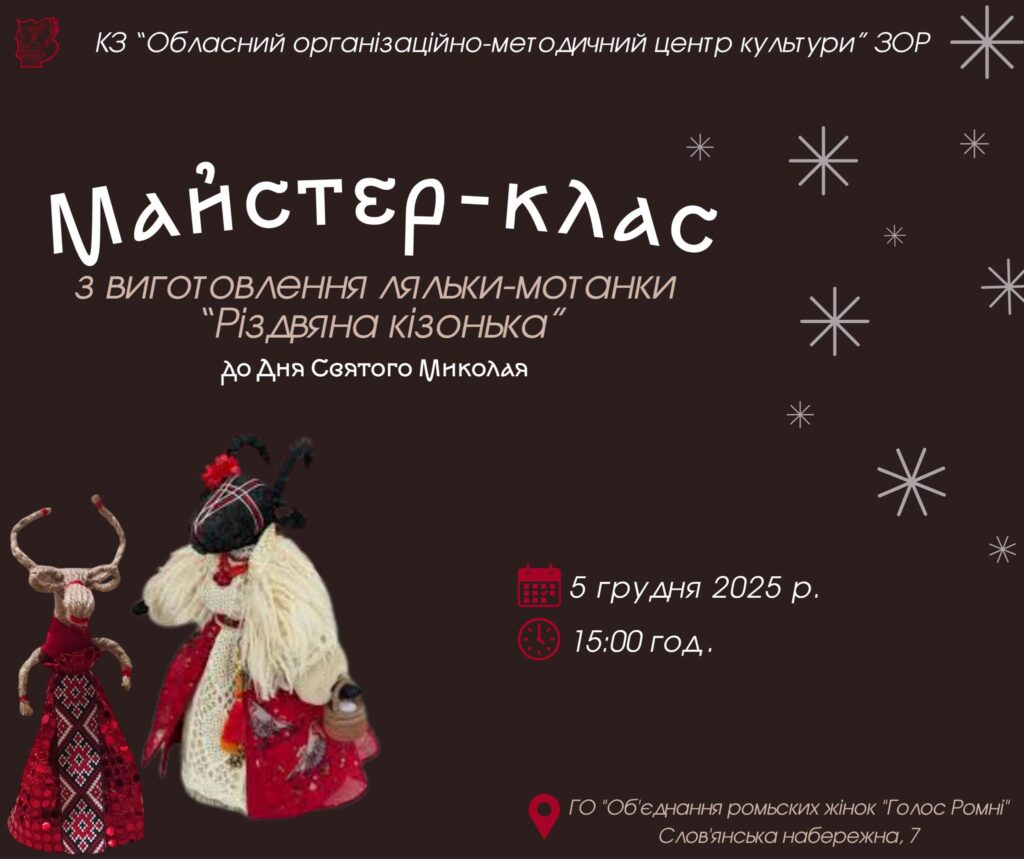 5 грудня працівники Центру культури – завідувачка народного етнографічного музею, заслужена майстриня народної творчості України Наталія Стегура та методистка Олена Ваш – проведуть майстер-клас із виготовлення ляльки-мотанки “Різдвяна кізонька”.
