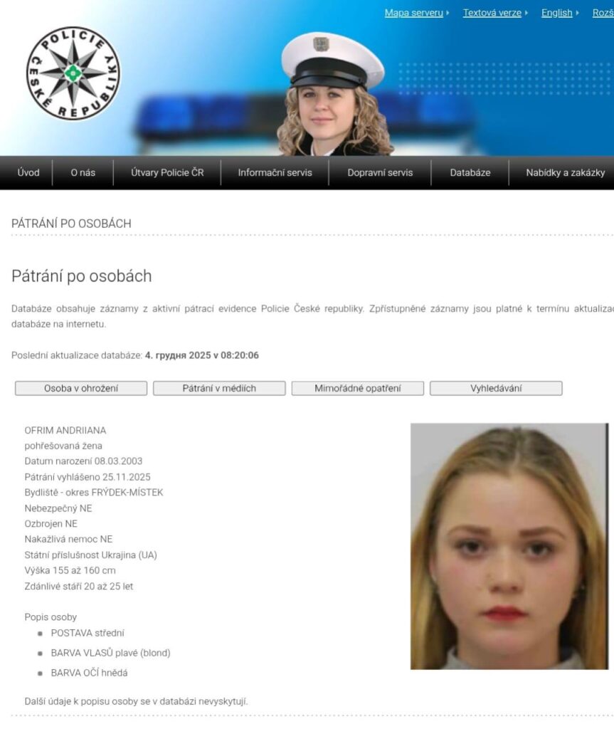 Чеська поліція оголосила в розшук 22-річну українку Андріяну Офрім, жительку Рахівського району Закарпаття. Офіційно її внесли до бази зниклих осіб 21 листопада 2025 року.