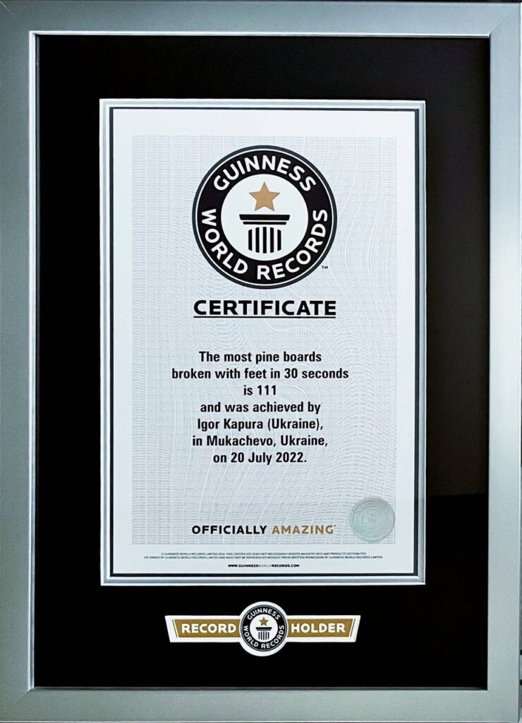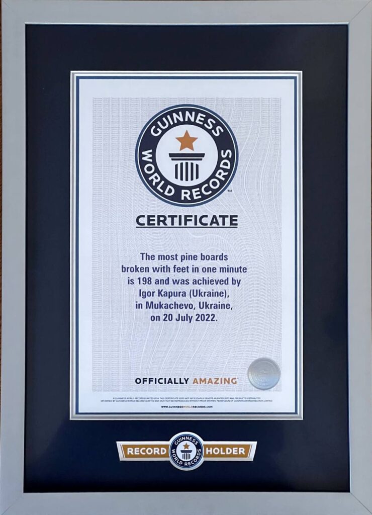 Представники Книги рекордів України згодом відправили мій результат в Британію, в Книгу рекордів Гіннеса, і менш ніж за місяць зі мною зв’язалися звідти й запропонували встановити рекорд. Тож, поки ми оформлювали документи, обговорили з представниками Книги рекордів України техніку, яку буду використовувати. Думали, як зробити, щоб це було цікаво людям і зупинилися на техніці розбивання ногою, ребром стопи. Тоді особистий рекорд в мене був – 10 дощок за один удар.