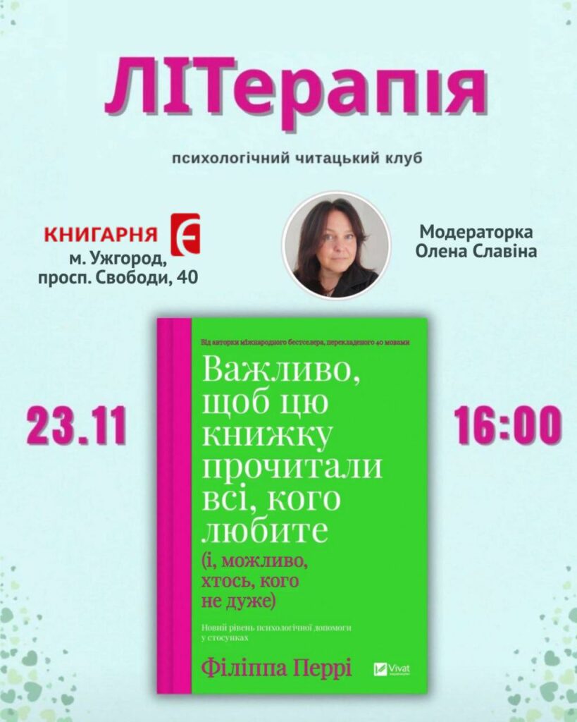 У наш час, коли поверхневі розмови часто витісняють щирі діалоги, з’являються люди, які створюють острівці глибини. Олена Славіна – практична та кризова психологиня, засновниця першого в Ужгороді психологічного читацького клубу «ЛІТерапія». Зустрічі відбуваються у книгарні «Є» на проспекті Свободи, і саме ця локація створює особливий настрій: серед книжкових полиць легше відкривати внутрішні двері та говорити відверто.