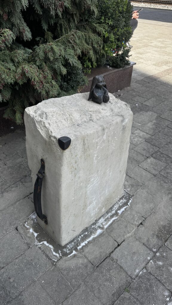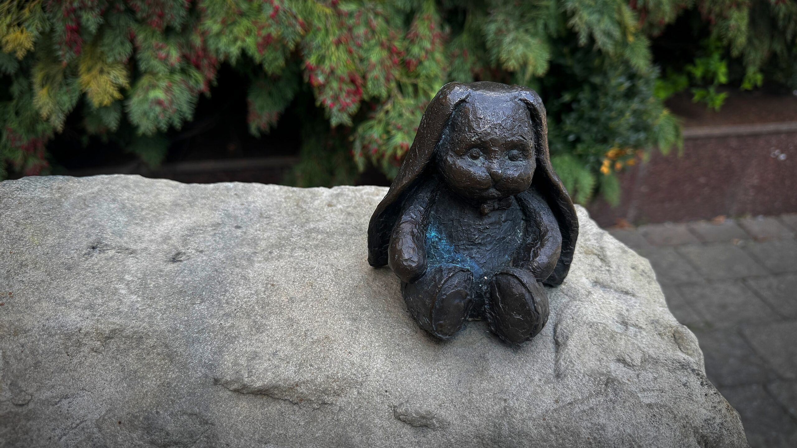 Композиція складається з кам’яної валізи з піщаника, кованої металевої ручки та дитячої іграшки – зайця.