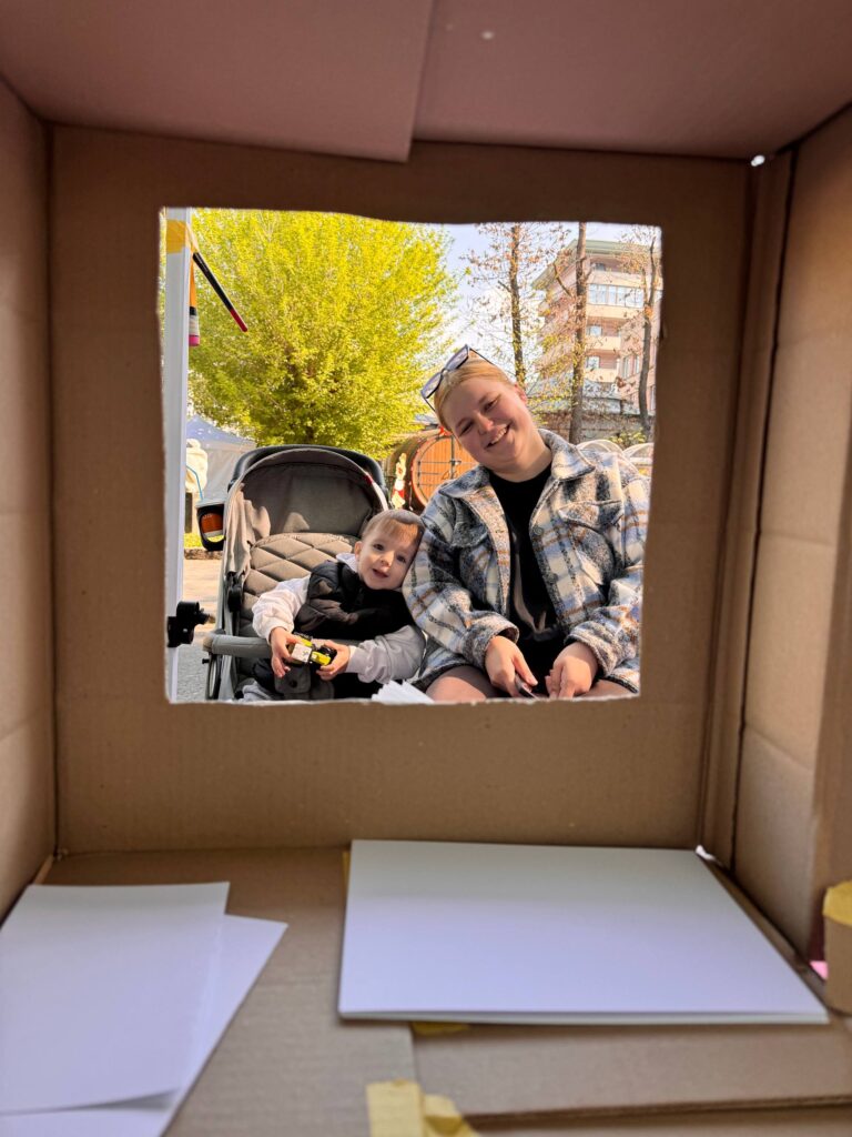 Спочатку я планувала назвати цей перформанс Art-саrd, але вирішила ще написати в Чат GPT, щоб він допоміг мені з назвою. Він запропонував декілька назв, серед яких я обрала Art-box, бо вона справді влучна. На виході всі руки в мене були чорні від фарби, але я отримала круту коробку.