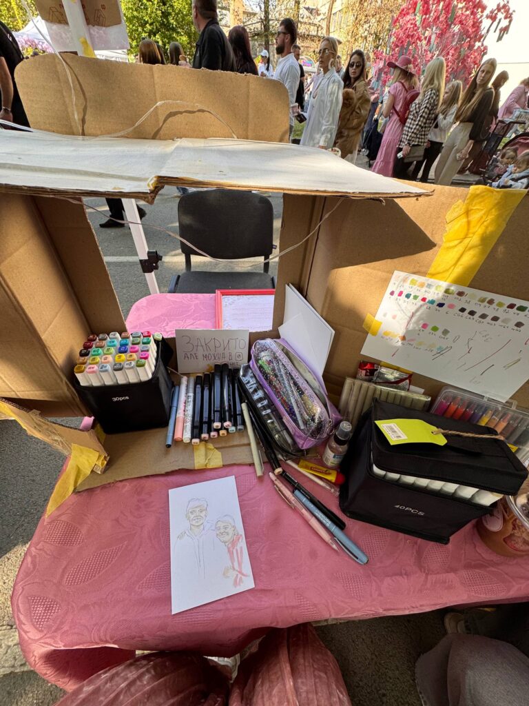 Це була моя помилка, бо до мене одразу великий натовп підійшов, тому в перший день фестивалю я кожні дві години ціну змінювала, бо з натовпом охочих важко було впоратися. Один портрет я малювала 15-20 хвилин, тому черга, звичайно, була. Хоча я дуже тішилася, що до мене підходять люди. А “монетки” я сама вигадала. Спочатку людина гроші обмінювала на “монетку”, а потім вставляла її у маленьку комірчинку, а з іншої я протягувала малюнок. Спочатку це на дітей розраховувала, але дорослим теж цікаво було, вони на відео знімали навіть.