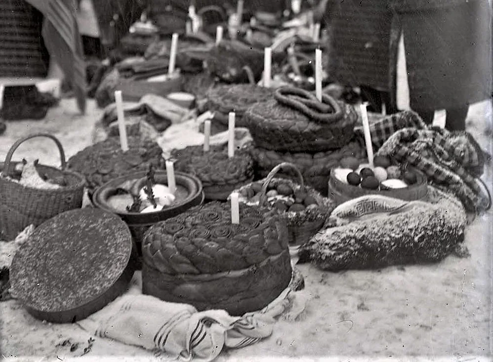 Напередодні Великодня, у суботу ввечері, готують святкові кошики. До них кладуть не лише паску, а й інші традиційні смаколики: копчене м’ясо (шовдарь), гострий хрін, розписані яйця (писанки), вершкове масло, сіль, вино та ковбасу (пікницю). Особливе місце займає фігурка баранчика, виготовлена з тіста або масла, що символізує Ісуса Христа. Вважається, що це забезпечить прихильність сил природи та захистить від стихійних лих. Також заведено ставити в кошик пляшечку домашнього вина. Це символ “плоду лози” та духовної радості. Важливо було обережно нести освячене вино, яке раніше зберігали у глечиках, адже пляшок із закрутками не було.